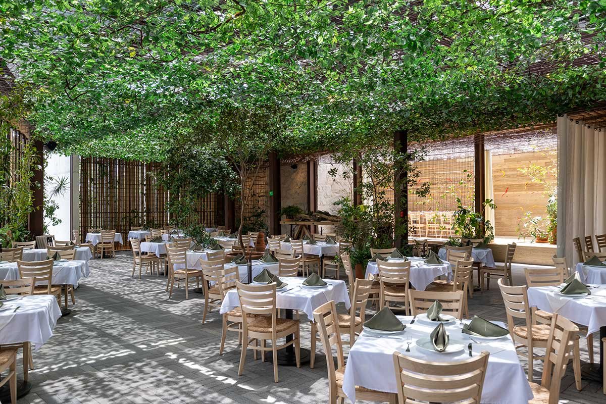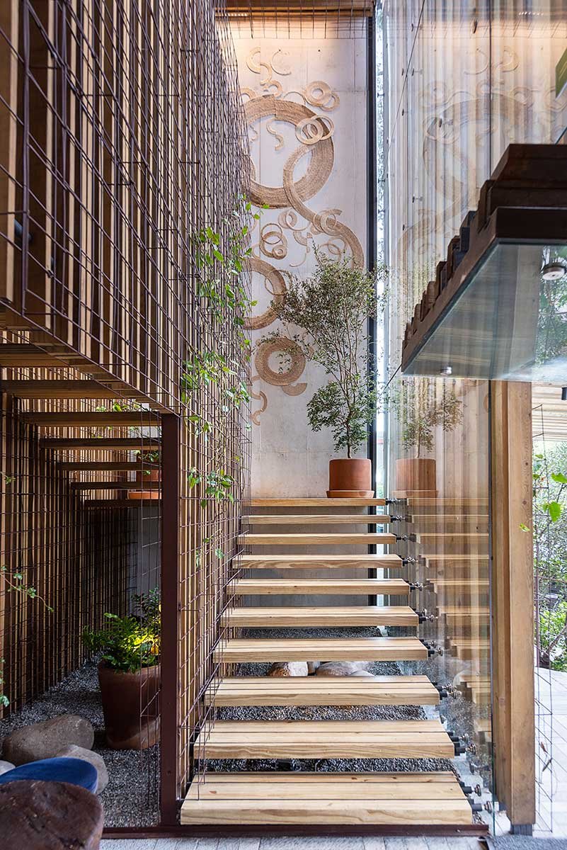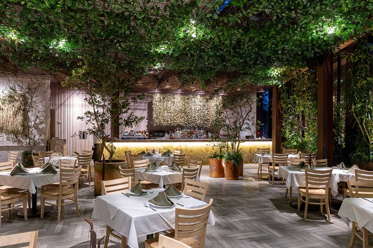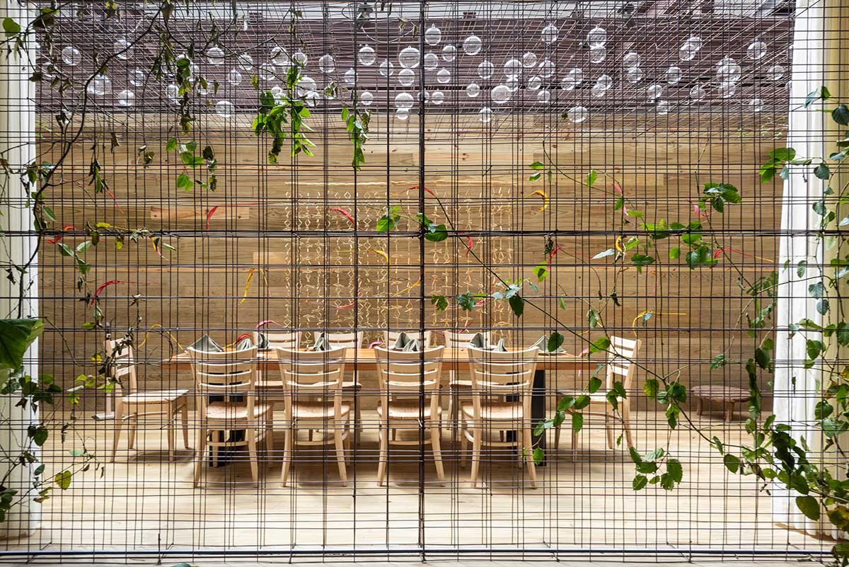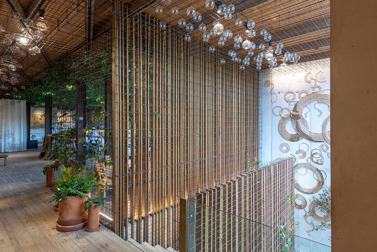Espacio concebido como una gran terraza de mar, inspirado en los modelos de talleres y naves industriales de estética metálica, fierros oxidados y estructuras aparentes, permite a los comensales envolverse en una red metálica que habilita un plafón falso de vegetación, la cual permite generar sombras del sol natural que entra en el espacio.